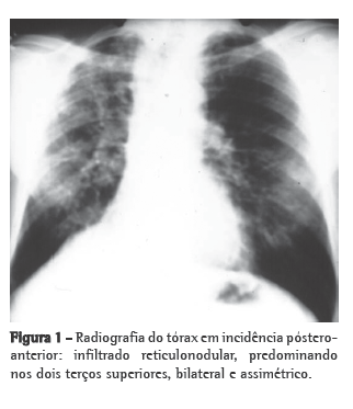 Na radiografia simples de tórax (Figura 1), pode ser visualizado infiltrado reticulonodular, predominante nos dois terços superiores de ambos os pulmões, assimétrico, com hipertransparência junto às bases pulmonares.(1,2,4)