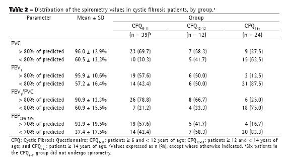 Our results show that children ≥ 6 and < 14 years of age have a satisfactory QoL, regardless of FEV1. In contrast, adolescents and adults with greater pulmonary impairment had worse scores in the respiratory, social role, body image, and physical domains. Other studies have also described these correlations, especially in the domains related to physical functioning and to body and health perception, in adolescents and adults with altered FEV1.(21,26,27)
