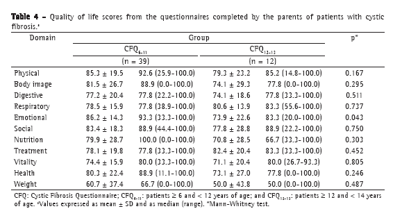 We applied the CFQ validated for use in Brazil by Rozov et al.(14) The CFQ6-11 was applied by the principal author of the study, whereas the other three questionnaires (CFQ12-13, CFQ14+, and CFQParents6-13) were completed by the patients themselves or by their parents. By means of these instruments, the following domains are assessed: physical; body image; digestive; respiratory; emotional; social; nutrition; treatment; vitality; health; social role; and weight. The scores for each domain range from 0 to 100, high scores indicating better QoL. In general, scores above 50 are considered to reflect good QoL.