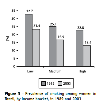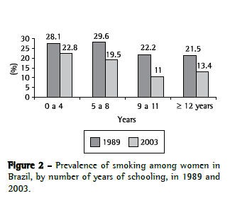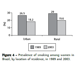 In Brazil, since 2001, successive epidemiological surveys have been conducted, and the results have shown that the prevalence of smoking has decreased in relation to that found in 1989, when the first nationwide study was conducted. Prior to 2000, the study conducted in 1989 was the only nationwide study of the prevalence of smoking. In 1989, the prevalence of smoking among women was 27%, having decreased to 18% in 2003 and to 13% in 2008. In addition, the rates of smoking among men and women have shown a trend toward convergence. The prevalence of smoking has been reported to be highest among women who live in rural areas, those with a lower level of education, and those with a lower income (Figures 1 to 4).(7)