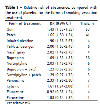 Since weight gain and the difficulty in managing the stressful pressures of everyday life are among the principal concerns of women, as well as being recognized reasons for relapse, an interesting option to be considered in this context is the prescription of bupropion or nicotine replacement therapies, especially gum, since these have been shown to play a role in delaying, although not always in preventing, weight gain.(53-55) Table 1 shows the forms of smoking treatment that have previously been studied, as well as the relative risk of abstinence compared with placebo.(54)