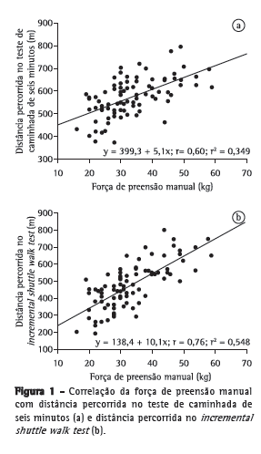 A avaliação da força de preensão manual (FPM) tem ampla aplicação clínica por ser um método barato, simples, rápido e não invasivo,(12,13) fornecendo um indicador do estado geral de saúde e da função muscular global.(12) Vários autores verificaram que a FPM apresenta correlação significativa e positiva com DTC6 e ISWD, especialmente em pacientes com DPOC.(7,14-16) Em idosos saudáveis, a FPM foi identificada como um fator determinante da DTC6.(7)