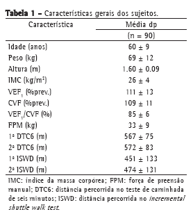 ResultadosAs características dos 90 sujeitos (40 homens) encontram-se resumidas na Tabela 1. Todos os sujeitos tinham função pulmonar normal. A distribuição etária da nossa amostra foi a seguinte: 40-49 anos (n = 20); 50-59 anos (n = 21); 60-69 anos (n = 26); e ≥ 70 anos (n = 23). A média do IMC ficou na faixa de sobrepeso (28 ± 3 kg/m2). Aproximadamente 52% dos sujeitos foram classificados como sedentários. Os valores de FPM, DTC6 e ISWD foram maiores nos homens que nas mulheres (43 ± 7 vs. 28 ± 5 kg, 641 ± 63 vs. 540 ± 72 m, e 600 ± 91 vs. 417 ± 103 m, respectivamente; p < 0,001 para todos).