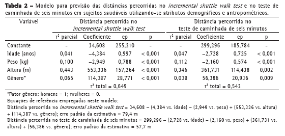 Até onde sabemos, apenas três estudos formularam equações de referência para a previsão da DTC6 e ISWD em indivíduos brasileiros.(8-10) Iwama et al.,(9) que avaliaram os valores da DTC6 em 134 brasileiros saudáveis (73 mulheres) ≥ 13 anos de idade, verificaram que idade e gênero explicaram coletivamente 30,0% da variância da DTC6. Priesnitz et al.(8) avaliaram uma amostra de conveniência composta por 188 crianças e adolescentes brasileiros saudáveis (92 do sexo masculino) com idade entre 6 e 12 anos, recrutados de três escolas de ensino fundamental. Os autores verificaram que idade, altura, peso e diferença absoluta entre FC pré- e pós-TC6 apresentaram correlação significativa com DTC6, explicando coletivamente 36,6% da variância da DTC6. Jürgensen et al.(10) avaliaram a ISWD em 131 indivíduos brasileiros. Utilizando um modelo preditivo, os autores mostraram que idade, altura, peso e gênero explicaram coletivamente 50,3% da variância da ISWD. Em um recente estudo multicêntrico, as equações preditivas variaram muito entre os centros (r2 ajustado = 0,09-0,73) e explicaram < 30% da variância da DTC6 em quatro dos centros avaliados.(11)
