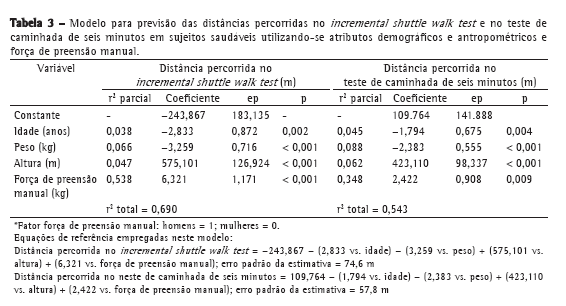 Objetivo: Desenvolver equações de regressão para a previsão das distâncias caminhadas nos testes de caminhada de seis minutos e incremental shuttle walk test (DTC6 e ISWD) baseadas em atributos demográficos, antropométricos e força de preensão manual. Métodos: Avaliamos a DTC6 e ISWD em 98 adultos saudáveis. Estatura, peso e força de preensão manual foram também avaliados. Equações ajustadas para idade, gênero, estatura e peso e equações, incluindo também a força de preensão manual, foram desenvolvidas dos dados de 90 participantes (40 homens; 60 ± 9 anos). Aplicamos prospectivamente as equações em 8 participantes (4 homens; 59 ± 10 anos) randomicamente selecionados da amostra inicial. Resultados: Idade, gênero, altura e peso explicaram coletivamente 54,5% e 64,9% da variância da DTC6 e ISWD, respectivamente, ao passo que idade, altura, peso e força de preensão manual explicaram coletivamente 54,4% e 69.0% da variância da DTC6 e ISWD, respectivamente. A diferença entre a DTC6 prospectivamente avaliada e prevista não foi significativa usando equações com e sem força de preensão manual (14 ± 57 m vs. 13 ± 67 m). Resultados semelhantes foram observados para a ISWD (25 ± 104 m vs. 25 ± 93 m). Conclusões: A força de preensão manual é um determinante para DTC6 e ISWD; entretanto, não foi capaz de aumentar o poder das equações ajustadas por variáveis demográficas e antropométricas. A validade de nossos modelos incluindo a força de preensão manual deve ser avaliada em pacientes com disfunção muscular esquelética.