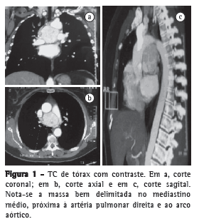 Uma paciente branca de 60 anos procurou tratamento no Departamento de Cirurgia Torácica do Hospital de Clínicas da Universidade Federal do Triângulo Mineiro com histórico de 2 anos de dor moderada e constante no hemitórax esquerdo. A paciente negava perda de peso e tabagismo. Apresentava hipertensão arterial, fibromialgia, depressão e doença de Chagas, todas controladas. O exame físico, os testes laboratoriais e a radiografia de tórax apresentaram resultados normais. O ecocardiograma revelou uma opacidade sólida e heterogênea entre a artéria pulmonar esquerda e o arco aórtico. A TC de tórax revelou uma massa bem definida no mediastino médio. A massa media 5.5 × 5.2 × 4.7 cm e apresentou realce intenso após a administração de contraste i.v. Não havia sinais de invasão, embora a massa exercesse leve compressão nas estruturas vasculares adjacentes (Figura 1).