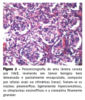 O diagnóstico de paraganglioma de mediastino foi confirmado por meio de análise histopatológica e imuno-histoquímica. O tumor apresentou resultado positivo para sinaptofisina, cromogranina A e proteína S-100, mas negativo para citoqueratina (Figura 2). Os linfonodos subcarinais ressecados não apresentaram sinais de metástase.