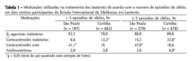 Comparando os achados de Curitiba com os de São Paulo (SP),(2) destaca-se o número elevado de crianças com sibilância, recorrente ou não, que fizeram uso de corticosteroides sistêmicos (Tabela 1).