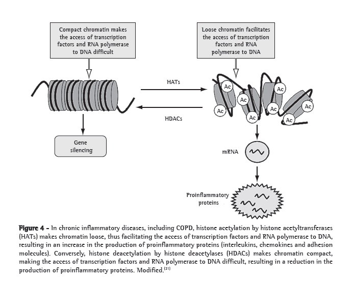 The suppression of proinflammatory genes by glucocorticoids is due, in part, to the recruitment of the enzyme HDAC2, which promotes the compaction of chromatin, thus preventing the transcription of proinflammatory proteins. As mentioned previously, the inflammation in COPD is relatively insensitive to treatment with corticosteroids. One of the mechanisms proposed to explain this relative resistance is the reduction in the levels of the enzyme HDAC2 through oxidative degradation induced by reactive species such as peroxynitrite (ONOO−), acrolein and 4-HNE.(9,35) The alveolar macrophages of patients with COPD present reduced concentrations of HDAC2 when compared with the macrophages of individuals with normal lung function, and this reduction is correlated with insensitivity to corticosteroids. The restoration of the expression of HDAC2 reverses this resistance.(36)