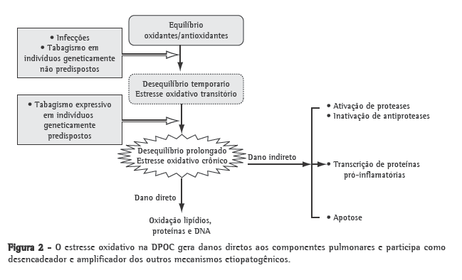O estresse oxidativo exerce um importante papel na gênese da DPOC através de danos diretos aos componentes do trato respiratório, bem como amplificando os outros mecanismos coparticipantes (Figura 2).