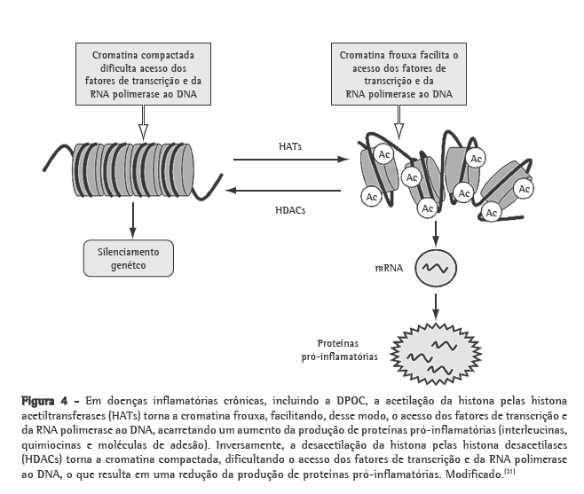 A expressão dos genes pode ser influenciada pelas enzimas histona acetiltransferases (HATs) e histona desacetilases (HDACs). A acetilação dos resíduos de lisina na terminação N dessas proteínas, catalisadas pelas HATs, remove cargas positivas e, desse modo, reduz a sua afinidade pelo DNA, tornando a cromatina menos compacta e mais acessível aos fatores de transcrição e à RNA polimerase. Inversamente, a desacetilação, catalisada pelas HDACs, torna a cromatina mais compacta e menos acessível (Figura 4). Consequentemente, na maioria dos casos, as HATs intensificam a transcrição, enquanto as HDACs reprimem a transcrição. O estresse oxidativo intracelular promove a ativação dos genes codificadores de várias proteínas pró-inflamatórias através de dois mecanismos: em primeiro lugar, ativando a enzima quinase kappa B, que degrada o complexo proteico inibidor kappa B, promovendo a liberação do fator nuclear kappa B; e, em segundo lugar, inativando a enzima histona desacetilase 2 (HDAC2), permitindo um maior grau de acetilação da proteína pela enzima HAT, resultando em descompactação da cromatina e maior acesso dos fatores de transcrição aos genes.(19,31,35)