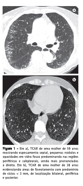 b) TCAR realizada com um aparelho GE (modelo HiSpeed LX/i; General Electric Medical Systems, Milwaukee, WI, EUA), com cortes com espessura de 1,0 mm, intervalo de tempo de 1,5 s, incremento de 10 mm, reconstrução de imagens com matriz de 512 × 512 pontos com algoritmo de alta resolução, largura de janela de 1.000 UH e nível médio de janela de −700 UH. A interpretação dos achados tomográficos foi feita de maneira independente por dois radiologistas com experiência em doença intersticial pulmonar. A TCAR foi analisada procurando-se os seguintes achados: pequenos nódulos, opacidade em vidro fosco, espessamento septal, faveolamento e bronquiectasia de tração. Para fins comparativos, os pacientes foram divididos em dois grupos, de acordo com a presença ou não de faveolamento (Figura 1).