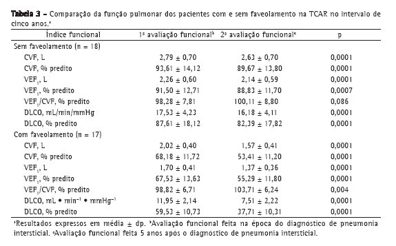 Considerando os grupos com e sem faveolamento na TCAR (17 e 18 pacientes, respectivamente), observou-se uma diferença estatística significante entre as médias de idade (43,12 ± 9,01 anos para o grupo com faveolamento vs. 51,83 ± 10,73 anos para o grupo sem faveolamento; p = 0,013), assim como entre as médias dos valores absolutos e percentuais de CVF, VEF1 e DLCO (p < 0,001). Entretanto, não houve diferença significativa em relação ao intervalo entre as duas avaliações (60,94 ± 2,02 meses para o grupo com faveolamento vs. 60,83 ± 2,54 meses para o grupo sem faveolamento; p = 0,95), assim como entre as médias dos valores percentuais de VEF1/CVF (p = 0,92). As alterações da função pulmonar no intervalo de cinco anos, de acordo com a presença ou não de faveolamento na TCAR, são mostradas na Tabela 3.