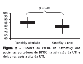A Tabela 2 demonstra que 86,3% dos pacientes sobreviventes 2 anos após a alta da UTI viviam em seu domicílio, 18,1% necessitavam de oxigênio domiciliar e 6% dependiam de suporte ventilatório. A Figura 2 demonstra uma redução na qualidade de vida dos pacientes quando comparadas as médias da escala de Karnofsky na admissão na UTI e 2 anos após a alta da UTI (85 ± 9 vs. 79 ± 11; p = 0,03). A Figura 3 mostra uma significante perda da autonomia dos mesmos através da comparação das médias dos escores da escala AVD na admissão na UTI e 2 anos após a alta da UTI (29 ± 5 vs. 25 ± 7; p = 0,01).