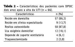 Concluímos que: (a) os pacientes com DPOC desta amostra apresentaram uma alta mortalidade na UTI e nos primeiros meses após alta hospitalar; (b) os sobreviventes desta amostra, quando avaliados 2 anos após a alta da UTI, realizavam adequadamente o seu autocuidado, apesar de apresentarem uma significativa redução na capacidade funcional, demonstrada pelas escalas de Karnofsky e AVD.