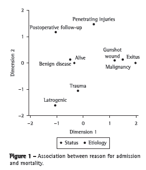 Of the 141 patients treated in the ICU, 53 (37.5%) had been admitted for trauma, chest trauma being prominent or involved in all of those cases. Of the 53 trauma patients, 7 (13.2%) died. The relationship between the reasons for ICU admission and mortality in patients receiving invasive MV is shown in Table 1. Of the 141 patients, 29 (32.1%) were admitted to the ICU for postoperative follow-up after moderate or major surgery and were therefore likely to have severe respiratory or hemodynamic problems. No mortality was observed in the follow-up of the patients who underwent elective surgery (resections, in 16 patients; emphysema, in 4; bullectomy, in 3; and esophagectomy, for lung abscess, in 6). Of the 141 patients, 19 (14.8%) had penetrating injuries (stab wounds), and 4 (21%) of those patients died. Respiratory diseases such as severe COPD, lung abscess, and empyema were the reasons for ICU admission in 12 patients (8.5% of the sample), and 1 (8%) of those patients died. In 11 patients (7.8% of the sample), the reason for ICU admission was inoperable primary or metastatic lung cancer, and 5 (45.4%) of those patients died. There were 11 patients (7.8% of the sample) who were admitted to the ICU for gunshot wound, and 6 (54.5%) of those patients died. Of the 6 patients (4.9% of the sample) admitted to the ICU for iatrogenic diseases (invasive MV-related pneumothorax, in 2; central catheterization related hemopneumothorax, in 2; catheter-related hemothorax, in 1; and pneumomediastinum, resulting from a tracheostomy complication, in 1), none died. Among the various reasons for admission, gunshot wound, stab wound, and malignancy were found to be significantly associated with mortality (p < 0.05). Specific reasons for admission were the major factors found to affect mortality in the correspondence analysis (p = 0.003; Figure 1).