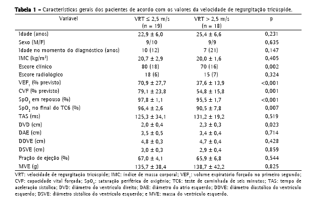 A Tabela 1 resume as características clínicas, funcionais pulmonares, radiológicas e ecocardiográficas dos pacientes de acordo com os valores da VRT. Dezenove pacientes apresentaram valores de VRT ≤ 2,5 m/s, sendo classificados como sem HP, e 18 pacientes apresentaram valores de VRT >2,5m/s, sendo classificados como tendo HP. Os valores de VEF1 e CVF em % do previsto foram significativamente menores no grupo com HP do que no grupo sem HP (p <0,001 e p = 0,001, respectivamente). Os valores de SpO2 em repouso e no final do teste de caminhada de seis minutos (TC6) foram significativamente menores no grupo com HP do que no grupo sem HP (p <0,001 e p = 0,007, respectivamente). Os valores de DVD diferiram significativamente entre os dois grupos (p = 0,023). A fração de ejeção do ventrículo esquerdo variou de 54 a 76% em toda a amostra, não havendo diferença significativa entre os dois grupos. Na análise com um ponto de corte conservador para a VRT, 11 pacientes, de um total de 37, apresentaram valores de VRT ≥ 2,8 m/s.