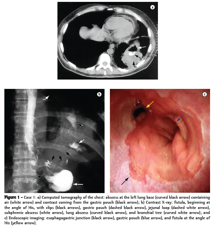 The fistula secretion moves to the subphrenic region and can cause abdominal sepsis, complications in the left lung, and gastrocutaneous fistula. Less frequently, drainage into the excluded stomach (gastrogastric fistulas) occurs.(3) Drainage into the bronchial fistula, and left lung abscess.(4) Certainly, bronchial tree (gastrobronchial fistula) has been this also occurred in our study. reported as a complication following trauma, esoph-The patients analyzed presented aspects in agogastric surgery (transhiatal esophagectomy due common, which facilitated the communication to neoplasias or megaesophagus), splenectomy, of secretion between the stomach and the respiand perforated gastric ulcer.(4,5) In these abdominal ratory system. Stenosis of the gastric pouch or of surgeries, there is the development of subphrenic the gastrojejunal anastomosis increased the presabscesses develop and cross the diaphragm via the sure and directed the food to the fistula at the lymphatic route, causing pleural effusion, gastro-angle of His, leading to the appearance of recurrent subphrenic infection, in the absence of an exit route to the skin, since the abdominal tube had already been removed.