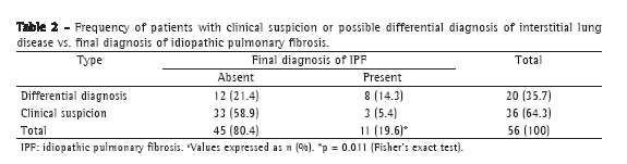 Clinical suspicion of ILD is fundamental due to the wide variety of differential diagnoses with similar clinical profiles. Our results show that the frequency of IPF cases was greater when IPF was only a possible diagnosis and lower when ILD was the prime suspect (p = 0.011). This underscores the need for ancillary tests in order to establish a definitive diagnosis.