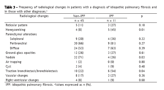 The most common radiological findings were alteration of the peribronchial parenchyma, in 69.9% of the patients; nodules, in 64.3%; and diffuse parenchymal alteration, in 55.4%. In patients with a final diagnosis of IPF, the most common radiological findings were parenchymal distortion (peribronchial), in 81.8%; diffuse parenchymal alteration, in 63.6%; and traction bronchiectasis, in 54.5% (Table 3). Nodules contributed significantly to the exclusion of the diagnosis of IPF (p = 0.03), whereas honeycombing and traction bronchiectasis aided in confirming the diagnosis of IPF (p = 0.01 and p = 0.043, respectively).