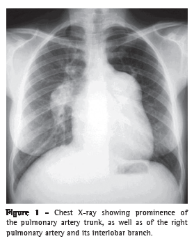 Clinically, PH syndrome manifests as dyspnea, oppressive chest pain, or syncope on exertion; radiologically, it manifests as dilatation of the pulmonary arteries and trunk; and, echocardiographically, it manifests as increased pulmonary artery systolic pressure, calculated on the basis of the tricuspid regurgitant jet velocity and the right atrial pressure.(4,6)