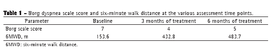 In view of the severity of the case, the frequent and life-threatening hospitalizations, the severe functional limitation, and the favorable results obtained with other patients, the need for a specific treatment for PAH was discussed. Sildenafil, at a dose of 20 mg administered three times a day, was chosen as an empirical treatment. In the observed period, there was a significant improvement in the symptoms, the functional capacity, and the 6MWD, as shown in Table 1.