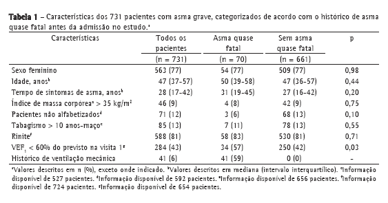 ResultadosA Tabela 1 demonstra as características clínicas iniciais dos 731 pacientes estudados, dos quais 563 (77%) eram do sexo feminino, com mediana de idade de 47 anos, e 12% não eram alfabetizados. A maioria dos pacientes apresentava rinite. A proporção de pacientes que relataram asma quase fatal na admissão do estudo foi de 10%. Desses, 59% relataram terem sido submetidos a intubação e ventilação mecânica durante a internação na UTI. Uma comparação entre os grupos demonstrou que os pacientes com asma quase fatal tiveram resultados de função pulmonar inicial inferiores àqueles dos pacientes sem asma quase fatal. Não houve diferenças entre os grupos quanto a idade, gênero, presença de obesidade, história de tabagismo, nível de escolaridade e diagnóstico de rinite.
