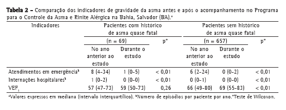 A melhora da gravidade da asma após a admissão no estudo está demonstrada na Tabela 2. Os pacientes com e sem asma quase fatal foram analisados separadamente. O número de exacerbações com atendimento em emergências e com internação hospitalar reduziu-se nos dois grupos com o tratamento oferecido. Entretanto, a melhora da função pulmonar foi observada apenas nos pacientes sem histórico de asma quase fatal.