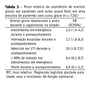 Na Tabela 3, a análise de regressão logística demonstra que os pacientes com asma quase fatal tiveram um maior risco de exacerbação da asma com necessidade de atendimento em emergência, internação hospitalar ou em UTI durante o acompanhamento no estudo, em comparação com os pacientes sem asma quase fatal. Os pacientes com asma quase fatal tiveram menor resposta ao tratamento do que aqueles sem asma quase fatal [OR (IC95%) = 0,4 (0,2-0,7)] porque foi menor a proporção de pacientes com asma quase fatal que apresentaram uma redução superior a 90% no número de atendimentos em emergência por crise de asma durante o acompanhamento no estudo. Neste estudo, 11 pacientes faleceram durante o acompanhamento. Não houve associação entre asma quase fatal e morte na análise de regressão logística.