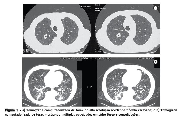 Este foi o primeiro relato de caso no qual foi observada a combinação de nódulo escavado, opacidades em vidro fosco e consolidações pulmonares numa TCAR (Figura 1). Este achado é importante porque inclui a SAM no diagnóstico tomográfico diferencial de pneumonia, linfoma, vasculite pulmonar, hemorragia alveolar, tuberculose, pneumocistose, nocardiose e doença fúngica.(5-9)