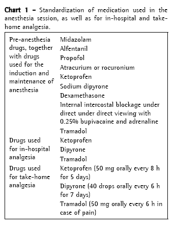 The anesthesia session and the preoperative, intraoperative and postoperative immediate analgesia (Chart 1) were standardized. All anesthesia sessions were performed by the same anesthesiologist.