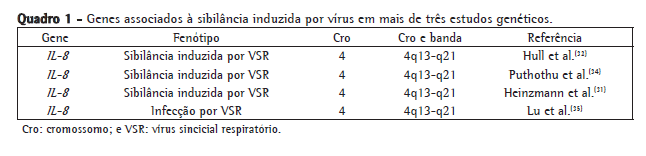 Estudos sobre as citocinas Th2 e sua relação com a asma focavam em IL-4 e IL-13. Esse fato se deve ao papel crucial dessas duas citocinas na geração de respostas Th2: A IL-4 é essencial para a maturação de células T virgens para células Th2 e para produção de IgE; e a IL-13 é um produto proteico que compartilha de vários perfis biológicos com IL-4, incluindo a produção de IgE a expressão do tipo MHC classe II.(18-21) Entretanto, a IL-8 é uma quimiocina que tem sido associada preferencialmente à inflamação induzida por vírus e é um dos maiores mediadores da resposta inflamatória. A IL-8 é secretada por muitos tipos de células e funciona como um fator quimotático, especialmente para neutrófilos. Além disso, acredita-se que o IL-8 tenha um papel na patogênese da bronquiolite, uma doença do trato respiratório comum em lactentes causada por infecções virais.(22,23) Considerando-se esses dados, IL-8 e outros membros da família genética da quimiocina podem ser considerados candidatos genéticos relevantes para as formas não atópicas de sibilância na infância.