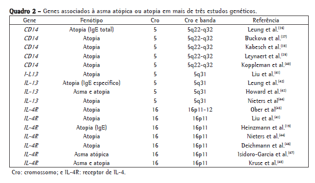 Vários genes candidatos têm sido estudados em distúrbios atópicos, e diferentes fatores contribuem para essa abundância de candidatos. Resultados de triagens do genoma forneceram evidências de ligações a múltiplos locais no genoma. Portanto, existem genes candidatos em muitas posições. Além disso, as vias imunológicas associadas à resposta alérgica envolvem uma grande variedade de mediadores inflamatórios. Entretanto, os resultados replicados em estudos de associação genética de asma atópica envolvem as regiões 5q31-32 e 16p11-12 do genoma humano (Quadro 2).