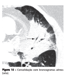 ConsolidaçãoRepresenta o preenchimento, com substituição do ar, dos espaços alveolares por um produto patológico qualquer, como, por exemplo, exsudato inflamatório (pneumonia), transudato (edema), sangue (hemorragia alveolar), lipoproteína (proteinose alveolar), gordura (pneumonia lipoídica), células (carcinoma bronquioloalveolar, linfoma, pneumonia em organização) ou conteúdo gástrico (pneumonia aspirativa).(32) Na TC, manifesta-se como um aumento da atenuação do parênquima pulmonar que impede a visualização dos vasos e dos contornos externos das paredes brônquicas. Broncogramas aéreos podem ser encontrados (Figuras 3 e 10). O valor de atenuação do parênquima consolidado, ao exame de TC sem contraste, raramente é útil no diagnóstico diferencial, exceto em algumas situações (por ex.: baixa atenuação na pneumonia lipoídica e alta atenuação na toxicidade por amiodarona).(33,34)
