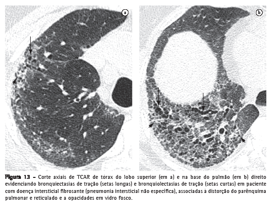 Bronquiectasia e bronquiolectasia de traçãoReferem-se, respectivamente, à dilatação brônquica e bronquiolar, causada pela retração do parênquima em decorrência de fibrose (Figura 13).(3) Manifestam-se como dilatações brônquicas e bronquiolares, geralmente irregulares, associadas à distorção do parênquima por fibrose e a outras alterações pulmonares (principalmente opacidades reticulares, opacidade em vidro fosco e consolidação). Possuem aspecto tubular, cístico ou microcístico (bronquíolos localizados na periferia), a depender da relação do eixo do brônquio ou do bronquíolo com o corte da TC. Esse último aspecto pode ser confundido com faveolamento, outra frequente alteração associada à fibrose pulmonar.(28)