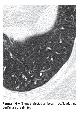 BronquiolectasiaDilatação bronquiolar. Análoga às bronquiectasias, mas em uma via aérea de muito menor calibre, identificada na periferia pulmonar (Figura 14). Manifestam-se como estruturas arredondadas ou tubulares, geralmente na periferia pulmonar, e com paredes espessadas ou preenchidas por secreção (ver Padrão de árvore em brotamento).(3,7) Também podem se associar a outras opacidades pulmonares e à distorção do parênquima em situações de fibrose.