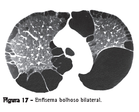Enfisema bolhosoDestruição bolhosa do parênquima associada a enfisema centroacinar, acinar distal (parasseptal) ou panacinar (Figura 17). É denominado de enfisema bolhoso gigante quando as bolhas, que podem variar de 1 a mais de 20 cm de diâmetro, ocupam pelo menos um terço do hemitórax.(7,39)