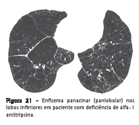 Predomina nos lobos inferiores e representa a forma de enfisema associada à deficiência de alfa-1 antitripsina. O enfisema panacinar se manifesta na TC como uma diminuição generalizada da atenuação pulmonar, com redução do calibre dos vasos sanguíneos nas áreas acometidas, com ou sem distorção dos mesmos (Figura 21).(37,38,42) O enfisema panacinar acentuado pode coexistir e combinar com o enfisema centroacinar grave. Na TC, pode ser indistinguível dos achados de bronquiolite constritiva grave.