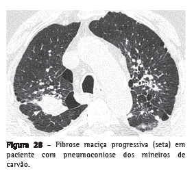 Fibrose maciça progressivaConfluência de pequenos nódulos pulmonares, em geral com fibrose associada (Figura 28). Frequentemente são bilaterais e predominam nos lobos superiores. Pode ser acompanhada de um aumento irregular do espaço aéreo na sua periferia. É geralmente encontrada em pacientes com história de exposição importante a poeiras inorgânicas (por ex.: pneumoconiose dos mineradores de carvão e silicose).(50) Achados tomográficos semelhantes podem ser encontrados em sarcoidose e talcose.(51)