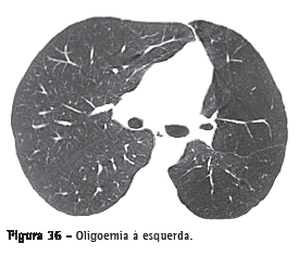 OligoemiaRedução focal, regional ou generalizada do volume sanguíneo pulmonar. A oligoemia apresenta-se como uma diminuição do calibre e do número de vasos pulmonares em regiões específicas ou difusamente, indicando que o fluxo sanguíneo é menor que o habitual (Figura 36).(3,7)