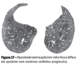 Opacidade (atenuação) em vidro foscoNa TC, corresponde ao aumento da densidade do parênquima pulmonar em que permanecem visíveis os contornos dos vasos e brônquios no interior da área acometida por um processo patológico (Figura 37). Este padrão de imagem está relacionado a espessamento do interstício, preenchimento parcial de espaços aéreos, colapso parcial de alvéolos, aumento do volume sanguíneo capilar ou ainda a uma associação desses mecanismos.(58,59) Deve ser distinguida de "consolidação" (Figuras 10 e 38), na qual os vasos não são identificáveis no interior da área de pulmão comprometido. Ver também Consolidação.