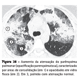 Opacidade parenquimatosa (Opacificação parenquimatosa)Aumento da atenuação do parênquima pulmonar que pode ou não obscurecer os contornos dos vasos e brônquios. O termo "consolidação" indica que as margens dessas estruturas não são aparentes (exceto pelos broncogramas aéreos), e "atenuação em vidro fosco" indica que, apesar de alterada a densidade dos pulmões, os vasos e vias aéreas ainda são identificáveis.(4,32) Deve-se dar preferência aos termos mais específicos "consolidação" e "opacidade em vidro fosco" (Figura 38).