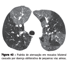 Padrão de atenuação (perfusão) em mosaicoAparência em retalho de regiões com atenuações distintas que pode representar doença parenquimatosa infiltrativa, enfermidade obliterativa de pequenas vias aéreas ou afecção vascular oclusiva (Figura 40).(62,63)