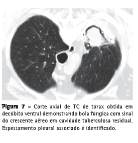 Bola fúngicaResulta da colonização fúngica de cavidades pulmonares preexistentes, geralmente secundárias à tuberculose ou à sarcoidose, mas pode também ocorrer dentro de cistos (por ex.: cisto broncogênico), bolhas e brônquios dilatados. Na maioria das vezes, a colonização é causada por Aspergillus spp., sendo comum, nesse caso, o uso do termo "aspergiloma". Representa um enovelado de hifas associado a muco, fibrina e restos celulares. Na TC, apresenta-se como uma imagem de uma massa, arredondada ou oval, com tendência a mover-se para uma localização pendente com a aquisição de imagens em decúbitos diferentes (Figura 7).(19) Outros achados comuns da bola fúngica incluem a presença do "sinal do crescente aéreo", calcificação amorfa no interior da lesão, aspecto espongiforme da lesão e espessamento pleural adjacente. O termo "bola fúngica" não deve ser utilizado como sinônimo de "micetoma", por representarem processos diferentes.(20)