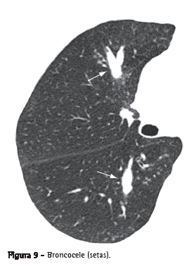 BroncoceleDilatação brônquica com retenção de secreções (impacção mucoide), geralmente causada por obstrução proximal, que pode ser congênita (por ex.: atresia brônquica) ou adquirida (por ex.: aspergilose broncopulmonar alérgica).(21) A broncocele apresenta-se como uma imagem tubular ou ramificada que se assemelha a um dedo de luva (Figura 9). Na TC, pode-se observar, em casos de atresia brônquica, uma redução da atenuação do parênquima distal à lesão.