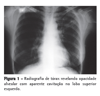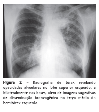 Uma nova PT foi realizada e continuou não reatora (0 mm). A baciloscopia de escarro (coloração de Ziehl-Neelsen) foi negativa em duas amostras consecutivas. Foi submetida à broncoscopia, que demonstrou lesão infiltrativa esbranquiçada ocluindo 50% da luz do brônquio do lobo superior esquerdo com intensa reação inflamatória adjacente. O exame anatomopatológico da lesão brônquica revelou extensa reação inflamatória crônica granulomatosa com necrose coagulativa. Ausência de sinais de malignidade. A pesquisa de BAAR foi positiva no lavado broncoalveolar. Recebeu o diagnóstico de tuberculose pulmonar, e instituiu-se tratamento com esquema I(rifampicina/isoniazida/pirazinamida). A paciente evoluiu bem, com melhora dos sintomas e do aspecto radiológico após 30 dias. Recebeu alta após seis meses de tratamento, com resolução total dos sintomas respiratórios e importante melhora da radiografia de tórax (Figura 4).