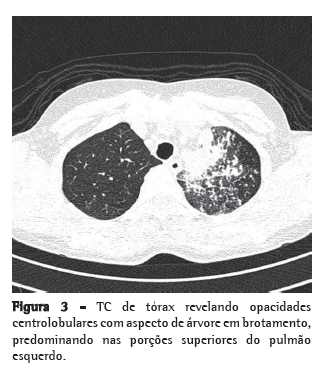 Negava tabagismo e etilismo. A paciente informou ter realizado prova tuberculínica (PT), cujo resultado foi não reator, antes do início do uso de adalimumabe, e que a radiografia de tórax naquela ocasião era normal segundo o médico reumatologista que a acompanhava. Após o uso de azitromicina (há três meses e meio) ainda recebeu mais uma infusão de adalimumabe. Ao exame físico, apresentava-se discretamente hipocorada, sem adenomegalias palpáveis. Presença de estertores finos em terço superior de hemitórax esquerdo e estertores grossos em terço médio de hemitórax direito, além de roncos esparsos. Deformidades articulares em mãos e pés. A radiografia de tórax demonstrava opacidades alveolares no lobo superior esquerdo, lobo inferior esquerdo e lobo médio, além de imagens sugestivas de disseminação broncogênica (Figura 2). A TC de tórax demonstrava opacidades centrolobulares com aspecto de árvore em brotamento (Figura 3).