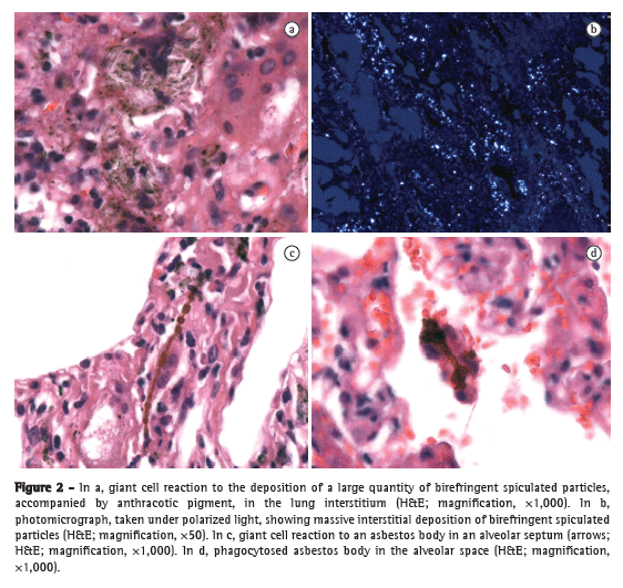 In the case reported here, in contrast with the habitual histopathological features of airway diseases caused by the inhalation of particles of a single type (asbestos or silicates), we found massive inflammatory infiltration, with hyperplasia of the bronchus-associated lymphoid tissue. In addition, the region most affected was that surrounding the terminal bronchioles, whereas asbestosis and talcosis predominantly affect the most distal airways. These findings suggest that the inhalation of a mixture of particles causes structural changes in airways of greater diameter and provokes a different immune response pattern.(9) In cases in which asbestos bodies are not seen but the patient presents with a strong history of occupational exposure, tissue analysis by means of X-ray diffraction or scanning/transmission electron microscopy can aid in preventing false-negative diagnoses.(8,9)