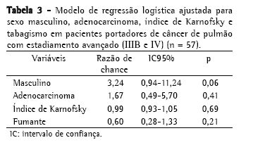 O primeiro modelo de análise de regressão logística, que incluiu variáveis clínicas, mostrou que depois de ajustado para sexo masculino, tipo histológico adenocarcinoma, índice de Karnofsky e fumante, não alcançou associação significante com os estádios IIIB e IV da doença. A Tabela 3 mostra estes resultados.