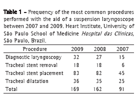 The addition of a rigid, 5-mm or 10-mm Hopkins-type endoscope, with a distal light source, or even of an endoscope commonly used for video-assisted laparoscopy/thoracoscopy attached to a video camera, allows excellent view and documentation of the airway during the procedure. The method can be an alternative for performing diagnostic and therapeutic tracheobronchial procedures when rigid bronchoscopy is unavailable. This makes it accessible to thoracic surgeons working in smaller facilities with limited resources and in referral centers requiring resource optimization in order to meet high demand. Since suspension laryngoscopy provides direct, selective access to the airway, it can be used similarly to rigid bronchoscopy for dilatation of high tracheobronchial stenosis, endoprosthesis insertion/removal, and resection of airway tumors, as well as for performing some procedures that are common in clinical practice, such as insertion and replacement of Montgomery T-tubes, as well as percutaneous tracheostomy.(4)